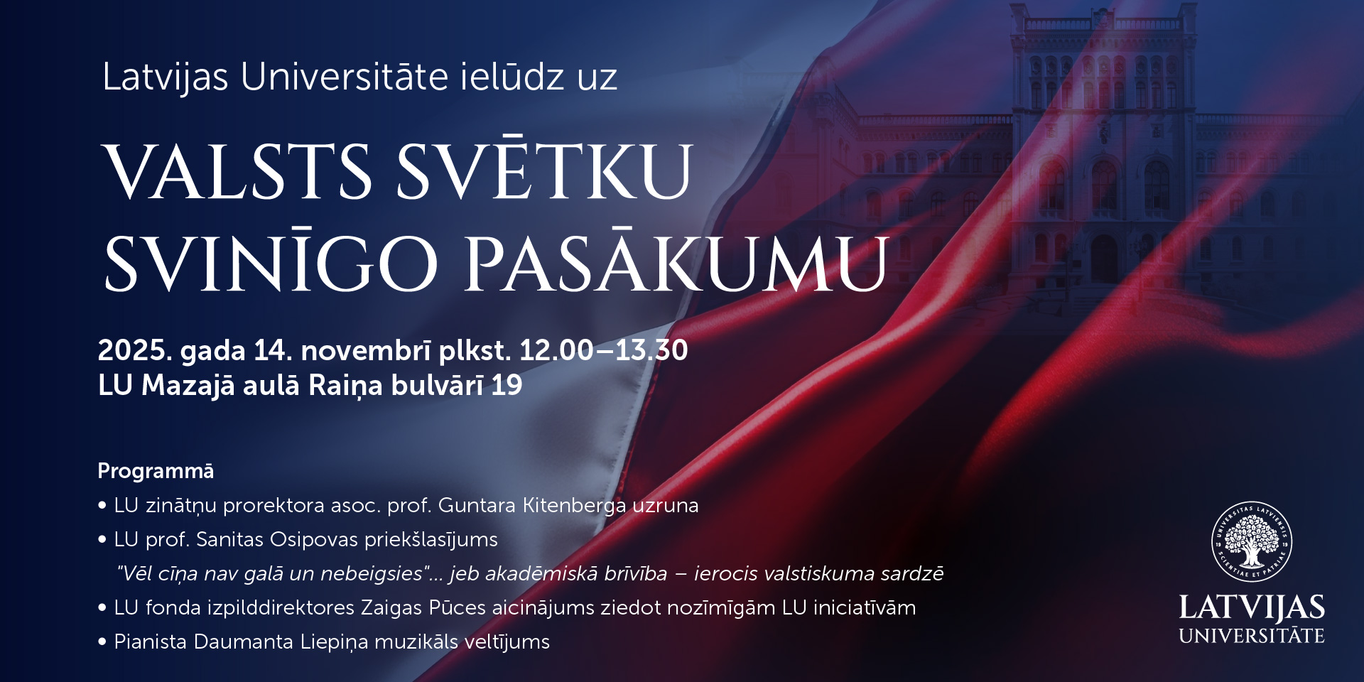 Latvijas Universitātes Valsts svētku pasākums ir iespēja vienoties pārdomās par Latvijas valstiskuma vērtībām, akadēmiskās brīvības nozīmi un Universitātes lomu mūsu valsts attīstībā.