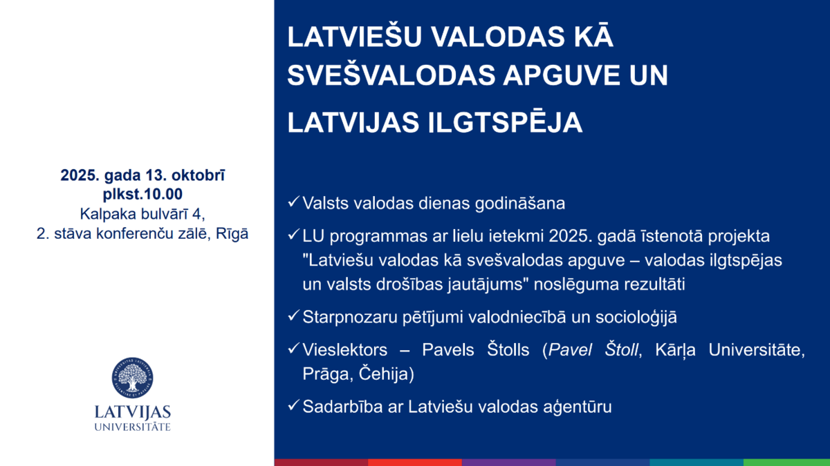 2025. gada 13. oktobrī plkst. 10.00 Kalpaka bulvārī 4, 2. stāva konferenču zālē aicinām uz LU programmas ar lielu ietekmi 2025. gadā īstenotā projekta "Latviešu valodas kā svešvalodas apguve – valodas ilgtspējas un valsts drošības jautājums " noslēguma rezultātu prezentēšanu seminārā "Latviešu valodas kā svešvalodas apguve un Latvijas ilgtspēja".