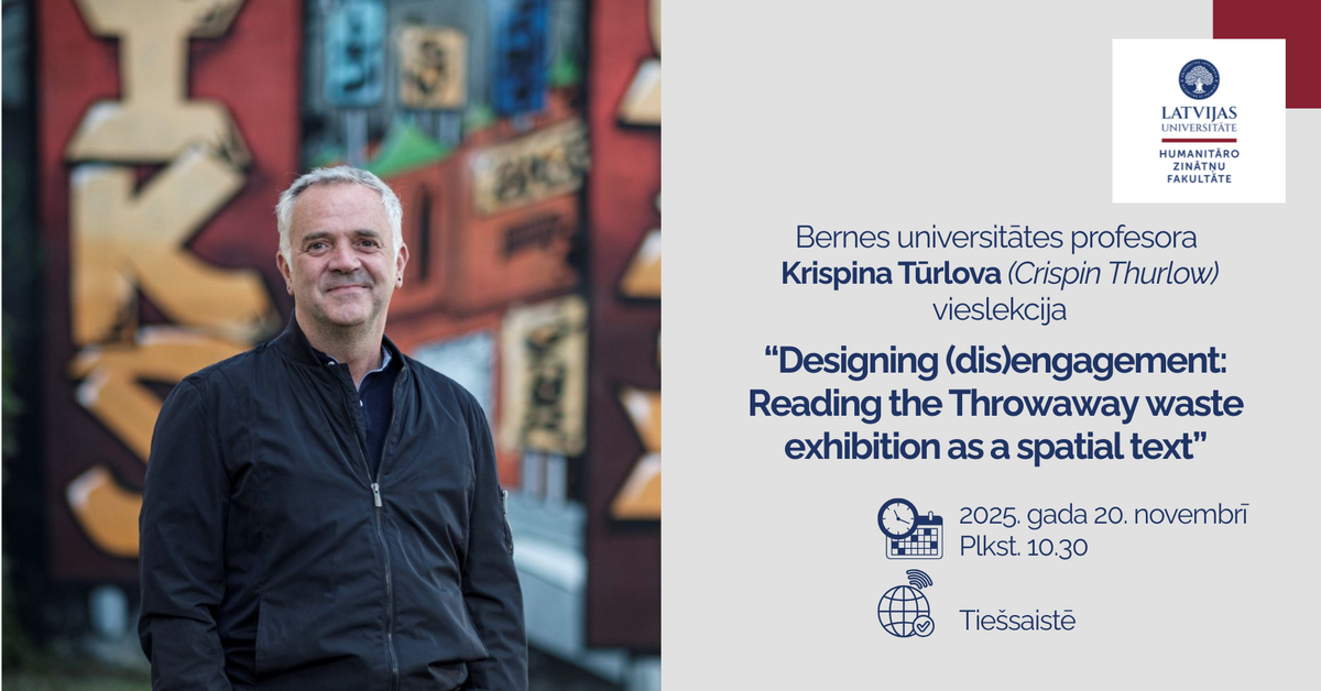 Latvijas Universitātes Humanitāro zinātņu fakultātes (LU HZF) Anglistikas nodaļa 20. novembrī plkst. 10.30 aicina interesentus uz Bernes universitātes profesora Krispina Tūrlova (Crispin Thurlow) vieslekciju “Designing (dis)engagement: Reading the Throwaway waste exhibition as a spatial text” (“Modelējot (ne)iesaistīšanos: vienreizlietojamo atkritumu izstādes kā telpiska teksta lasījums"). Lekcija notiks tiešsaistē Zoom platformā.