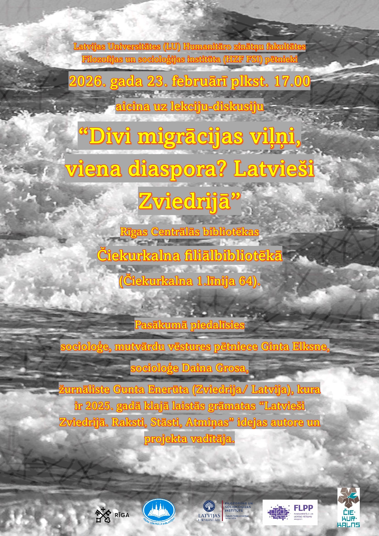 Latvijas Universitātes Humanitāro zinātņu fakultātes Filozofijas un socioloģijas institūta (LU HZF FSI) pētnieki 2026. gada 23. februārī plkst. 17.00 aicina uz lekciju–diskusiju “Divi migrācijas viļņi, viena diaspora? Latvieši Zviedrijā”, kas notiks Rīgas Centrālās bibliotēkas Čiekurkalna filiālbibliotēkā (Čiekurkalna 1. līnija 64).