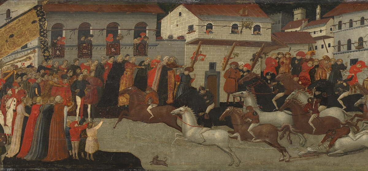 Panel from a Cassone: The Race of the Palio in the Streets of Florence, 1418. Giovanni Francesco Toscani (Italian, c. 1380–1430).The Cleveland Museum of Art, Holden Collection, Public Domain.